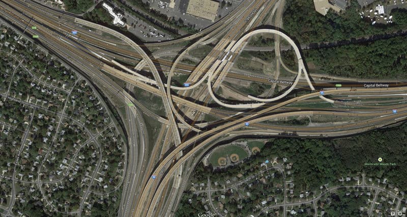 This is a fairly accurate build of the Springfield Interchange just south of Washington DC in the USA. It manages access to and from I-95, I-395, I-495 (The Capital Beltway) and local roads.