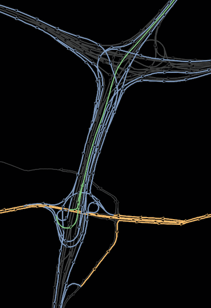 There are 2 versions of this interchange. Because the game does not support reversible roads (I-95 has separated HOV/Express lanes that change traffic direction depending on traffic conditions, easing conjestion either in-to or out-of the city center), some creative re-design was necessary. In order to keep the model as accurate as possible, there are two intersections of express traffic to the north of the model. A second version of this asset has been re-designed to prevent this for in-game use.