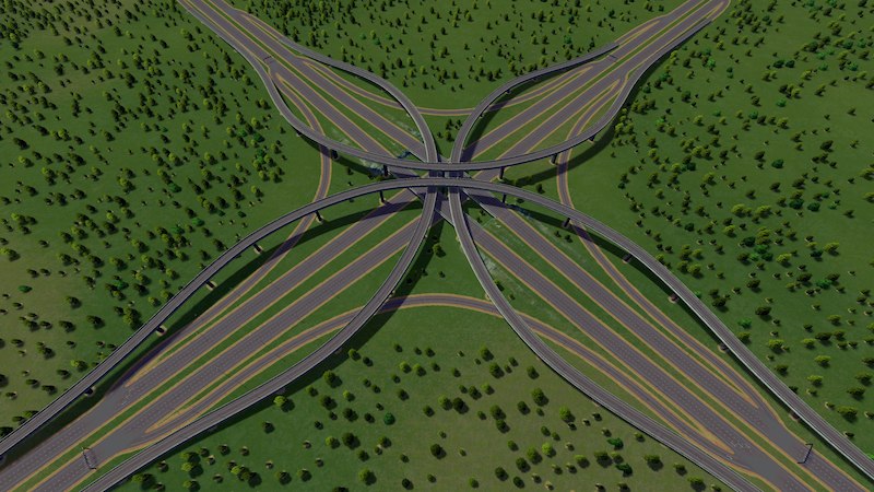 A high-speed stack interchange, different from my previous 5-level one because of its reduced height and more sweeping curves. I’d say this is very much an ‘I-20 near Dallas, TX’[en.wikipedia.org]-type of interchange; they seem to grow on trees there!