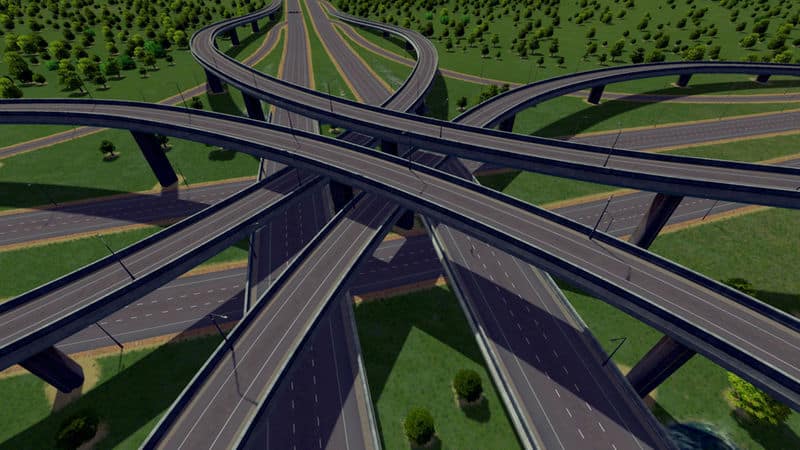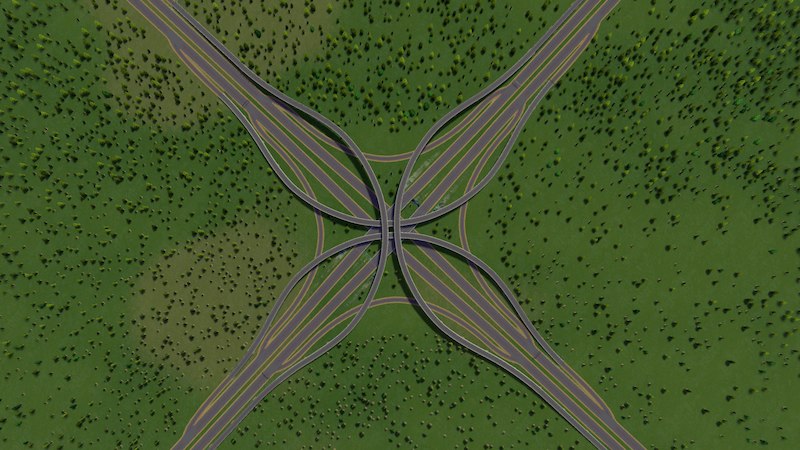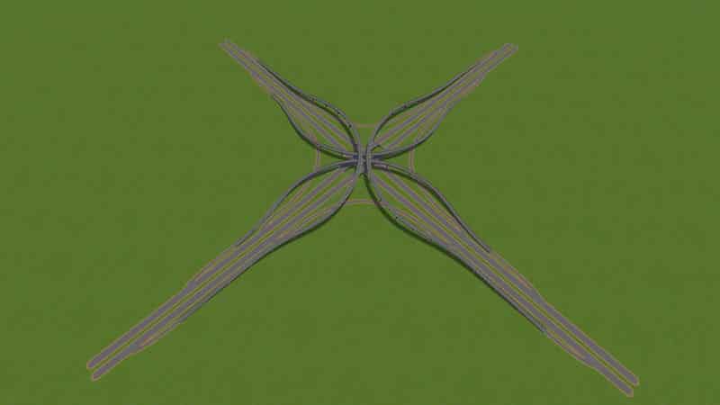 A high-speed stack interchange, different from my previous 5-level one because of its reduced height and more sweeping curves. I’d say this is very much an ‘I-20 near Dallas, TX’[en.wikipedia.org]-type of interchange; they seem to grow on trees there!