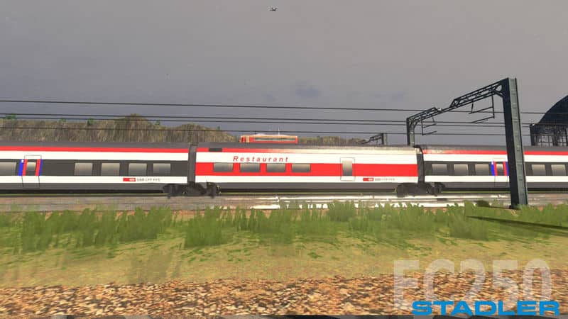 – Train is composed of 5 different trailers, including: 1st class Engine, 1st class car, 2nd class cars, SBB Resto, 2nd class end car (modeled as engine)
