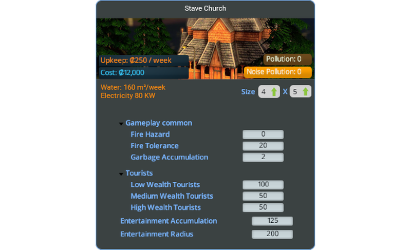 Adds a Stave Church as a ploppable building in the game. It can be found under the “Parks” category.