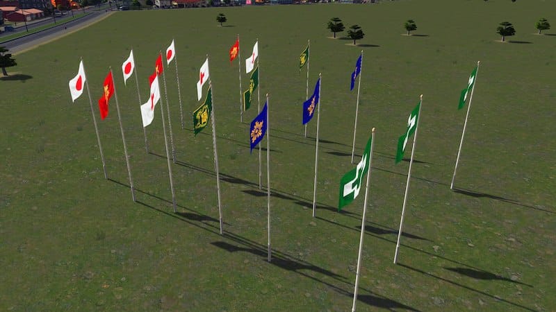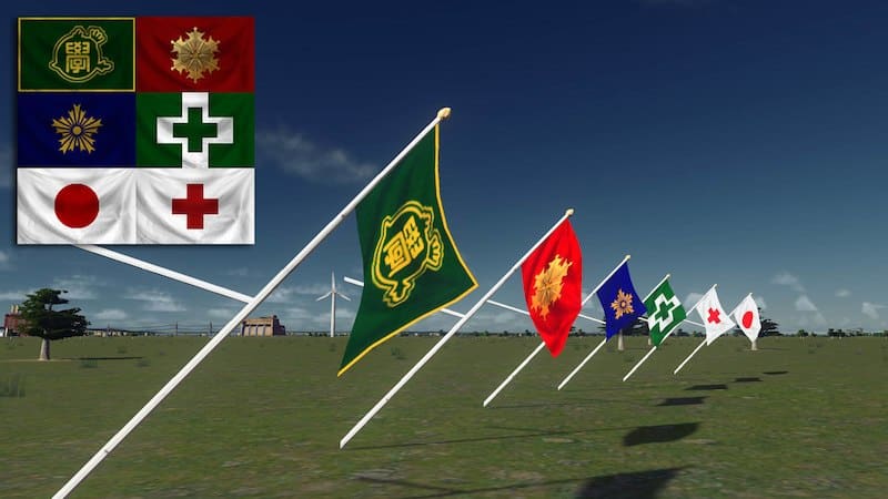 ゲーム標準では欧州6カ国の風にはためく旗がありますが、このMODではそれにスクリーンショットにあるような日本風の旗を追加して、地面や壁のポールに掲げられるようになります。
