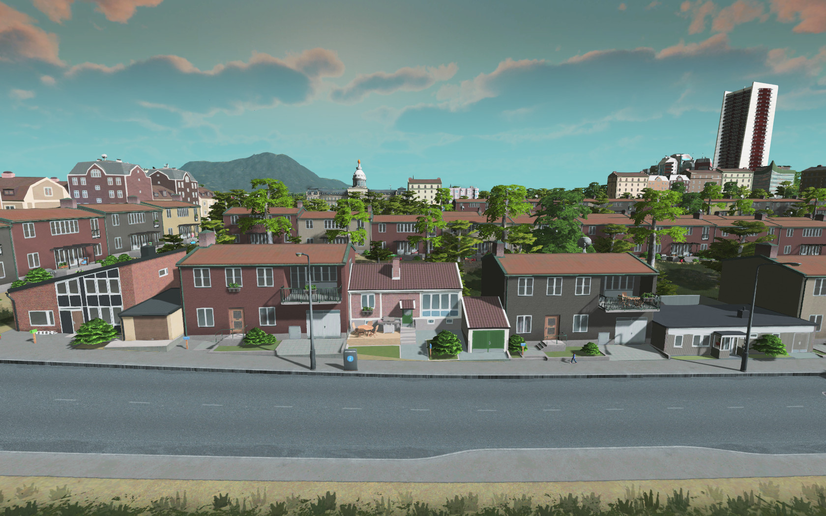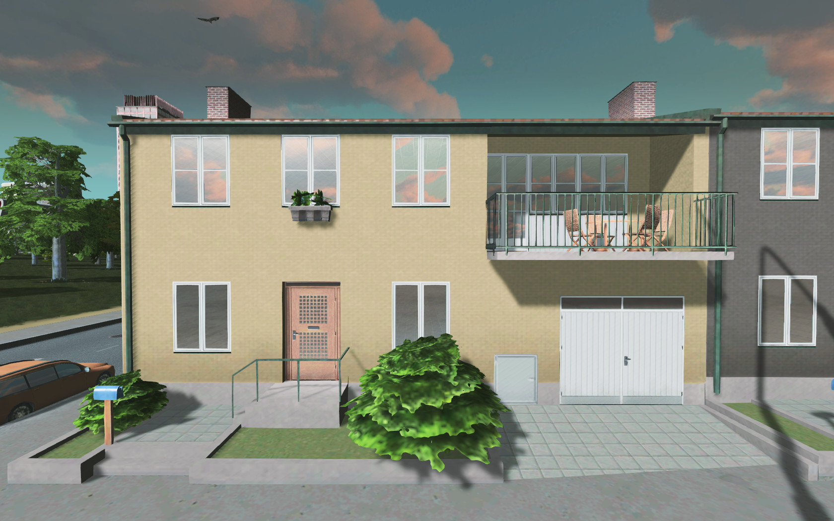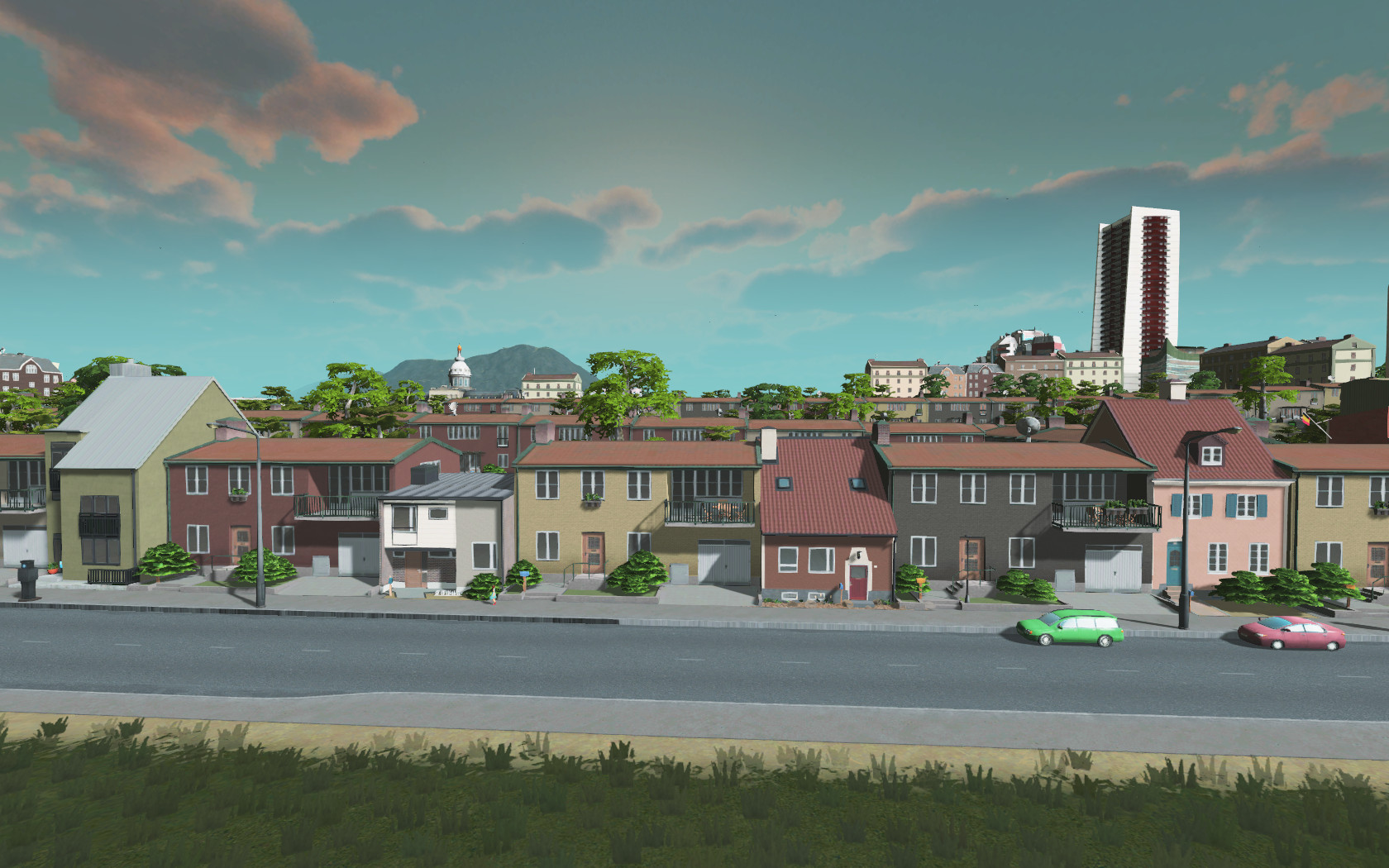 Lidingö island, just east of Stockholm proper, is home to wealthy people, beautiful nature, and the ever popular Mölnahöjden neighbourhood. I’ve merged elements from several of the buildings found there to make this large terraced house. IRL the facades are all beige, but I like colour so I added some red, yellow and brown to the paint bucket. I quite like the result, if I may say so myself.