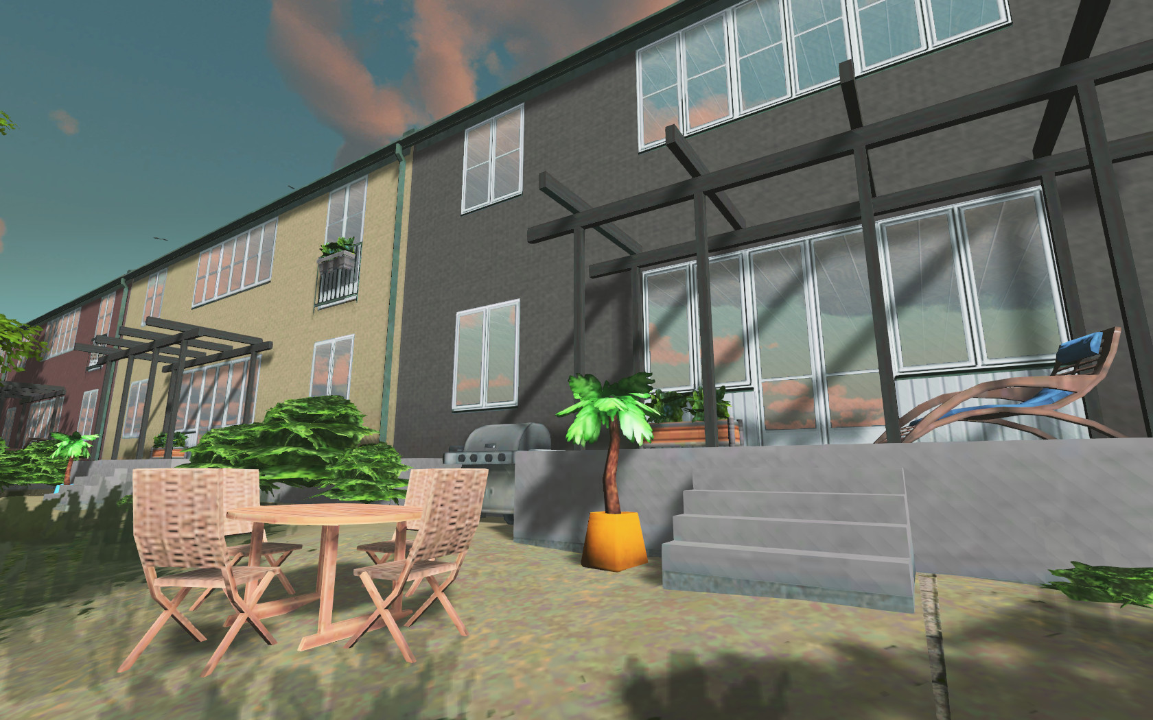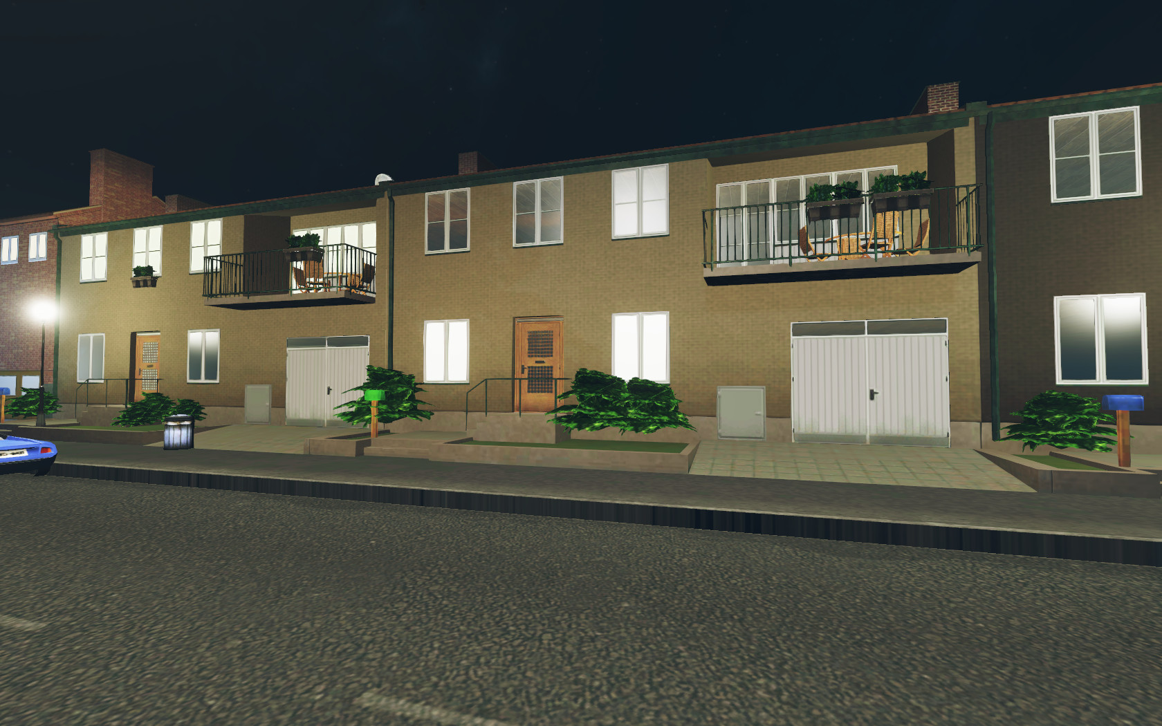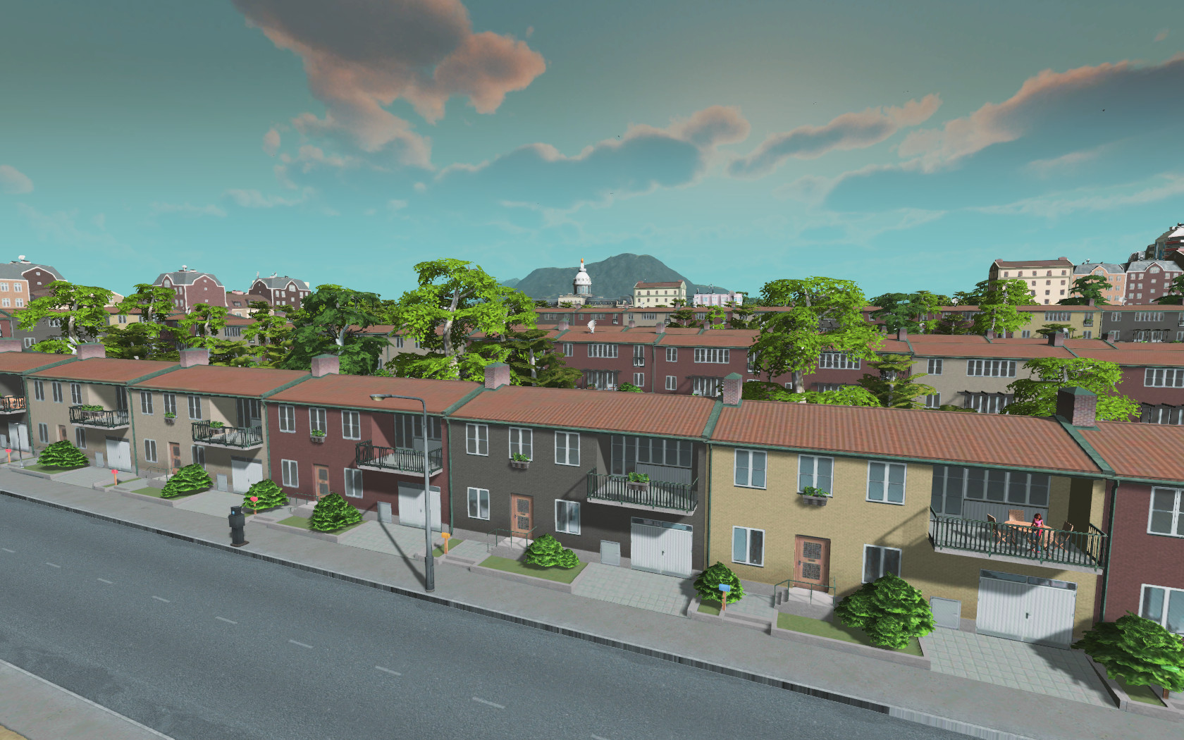 Lidingö island, just east of Stockholm proper, is home to wealthy people, beautiful nature, and the ever popular Mölnahöjden neighbourhood. I’ve merged elements from several of the buildings found there to make this large terraced house. IRL the facades are all beige, but I like colour so I added some red, yellow and brown to the paint bucket. I quite like the result, if I may say so myself.
