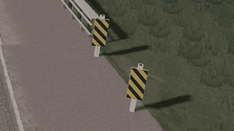 Small post with hazard stripe sign, for marking obstacles, roadside hazards, curves, etc. Left and right versions included.