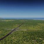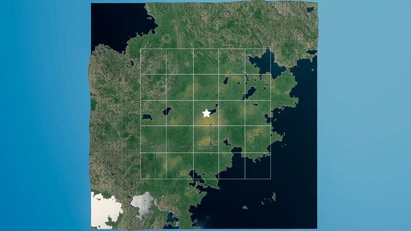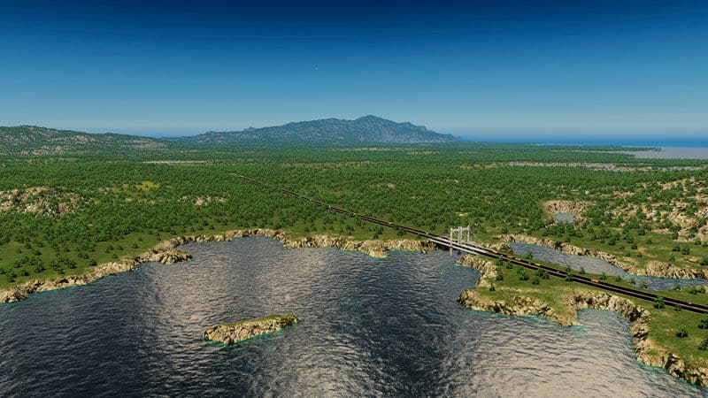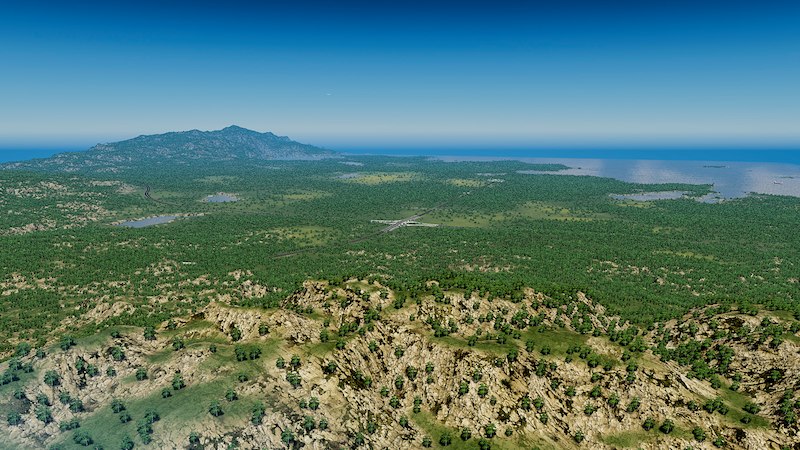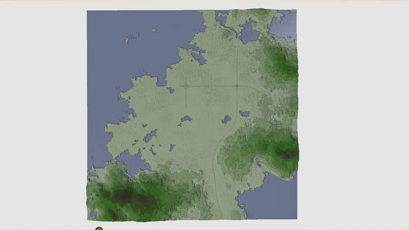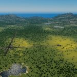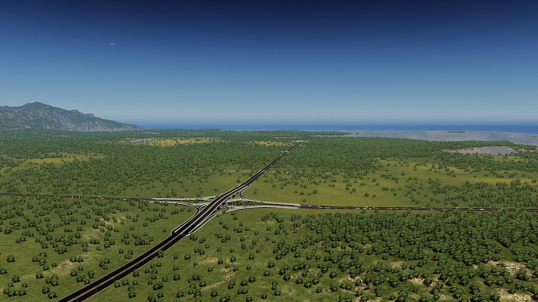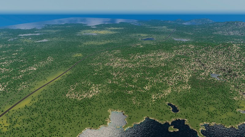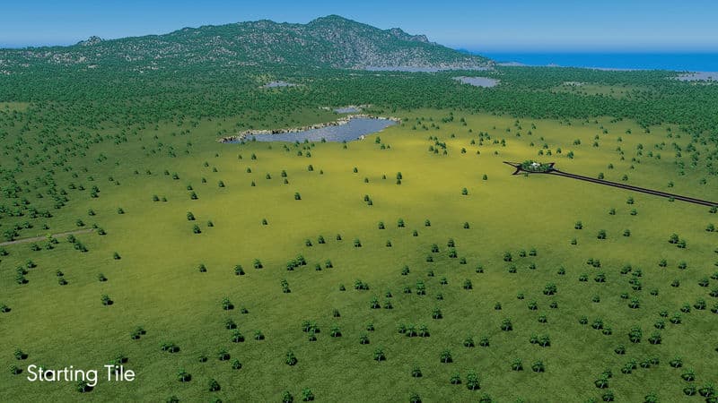 This big open land is almost completely flat in the 25 tiles area. North of the rail line you will find rolling hills, which eventually become large mountains on the edge. The other edge of the map is a large ocean.