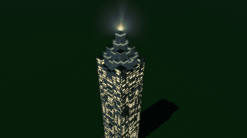 -Realistic edge lighting that recreates how the actual building in Atlanta is lit at night, including single spotlight at pinnacle