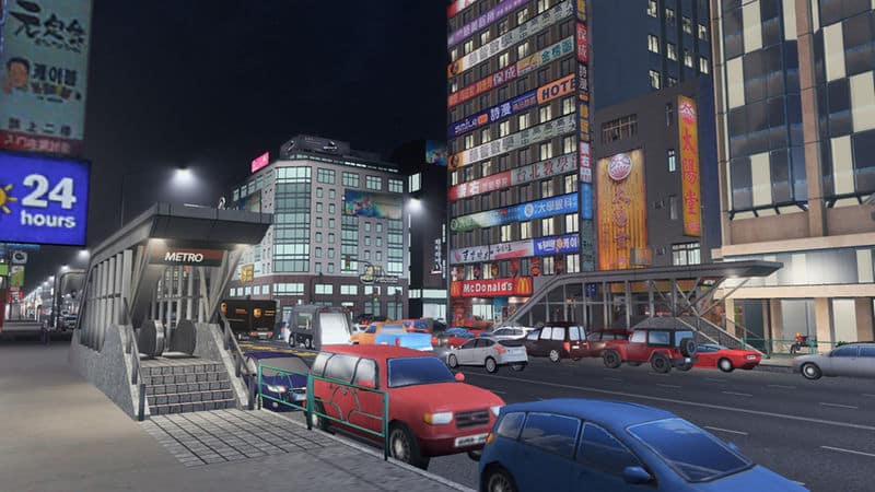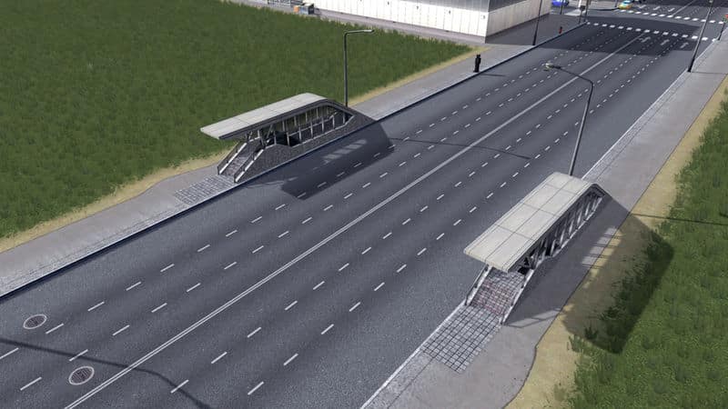 This is a metro station with transparent glass and entrances/exits at both side of the avenue. It’s placable anywhere and can be placed on top of every vanilla 4- and 6-lane avenue, so it won’t disrupt the wall-to-wall building row, suitable for the dense area in your city. Cims can also use it as underpass to cross the avenue.