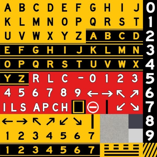 • Runway sign (Red): 0-9, R,L,C, 6 Arrows, separator [sign and ground]