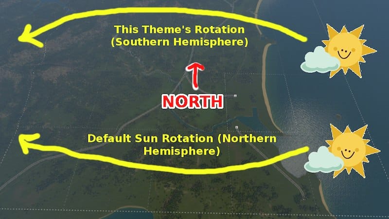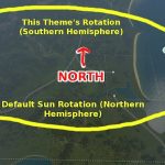 If you want to make a theme with correct sun rotation for yourself so you don’t have to flip your real location heightmap upside down, you move the longitutde slider in the theme creator to the left side of the middle point. Time Machine mod can also be used by users instead.