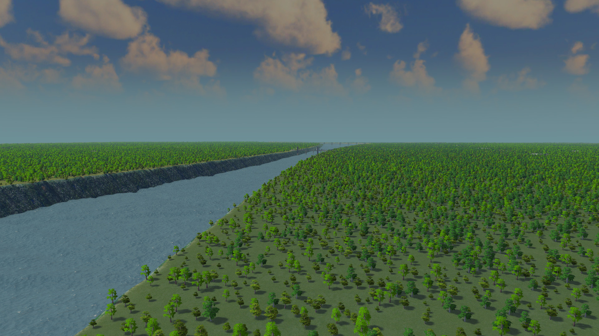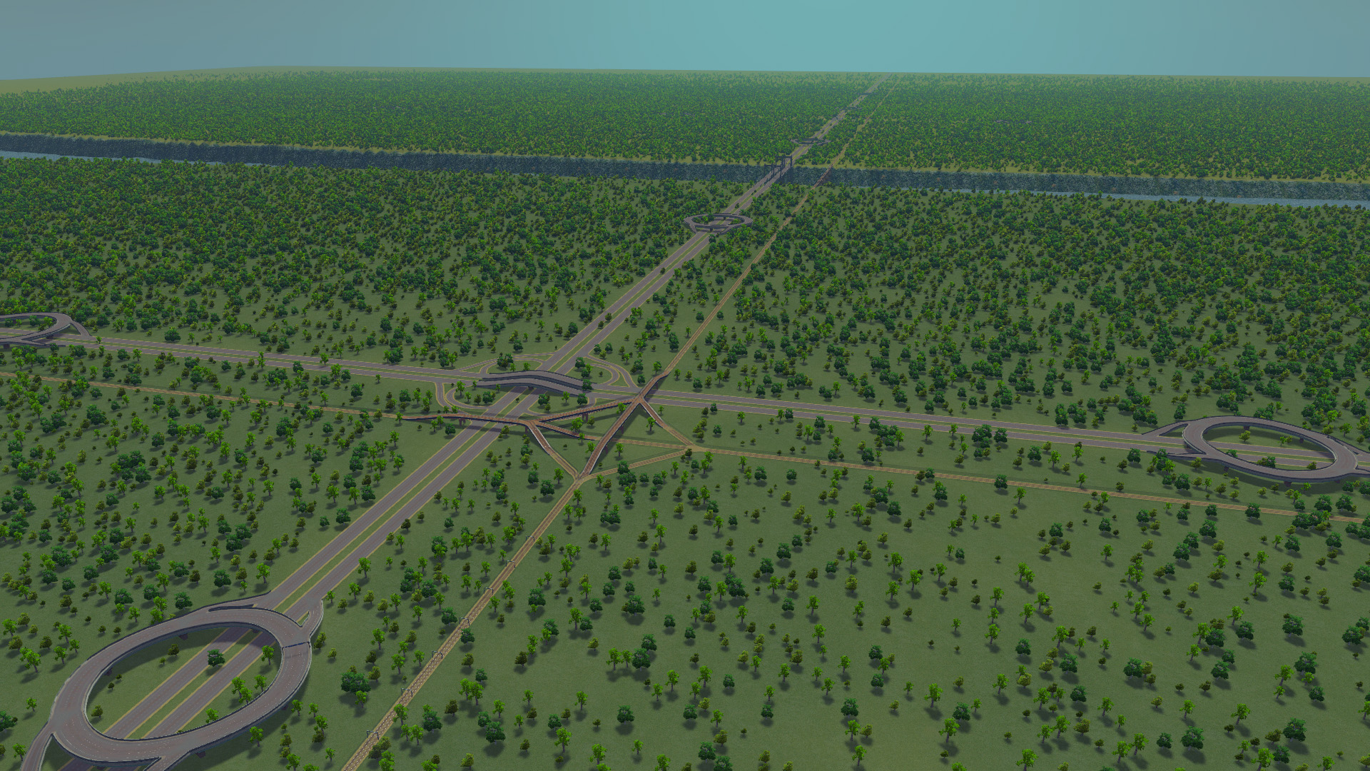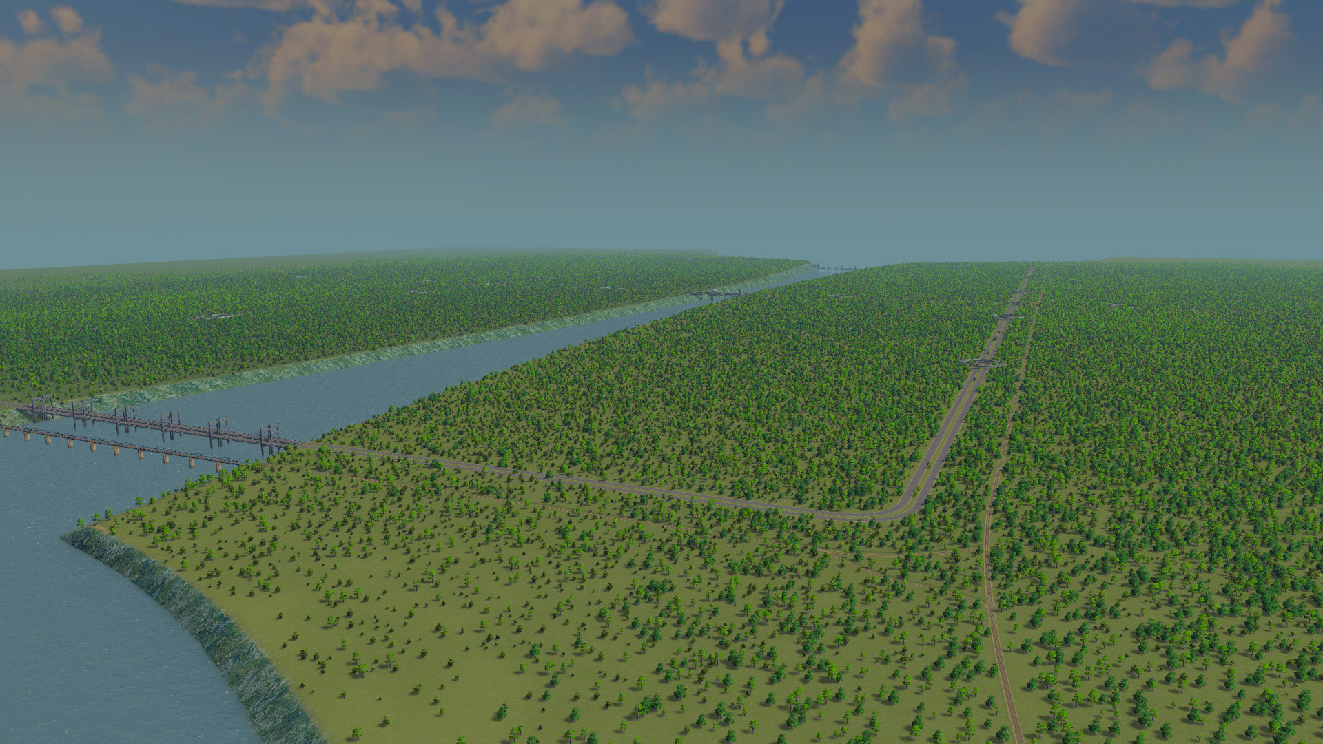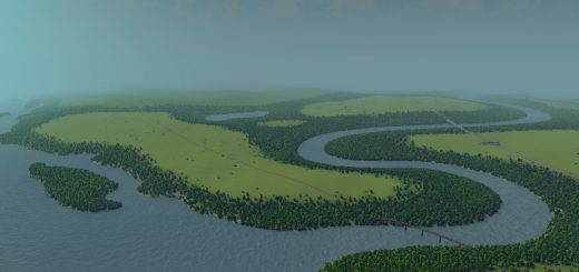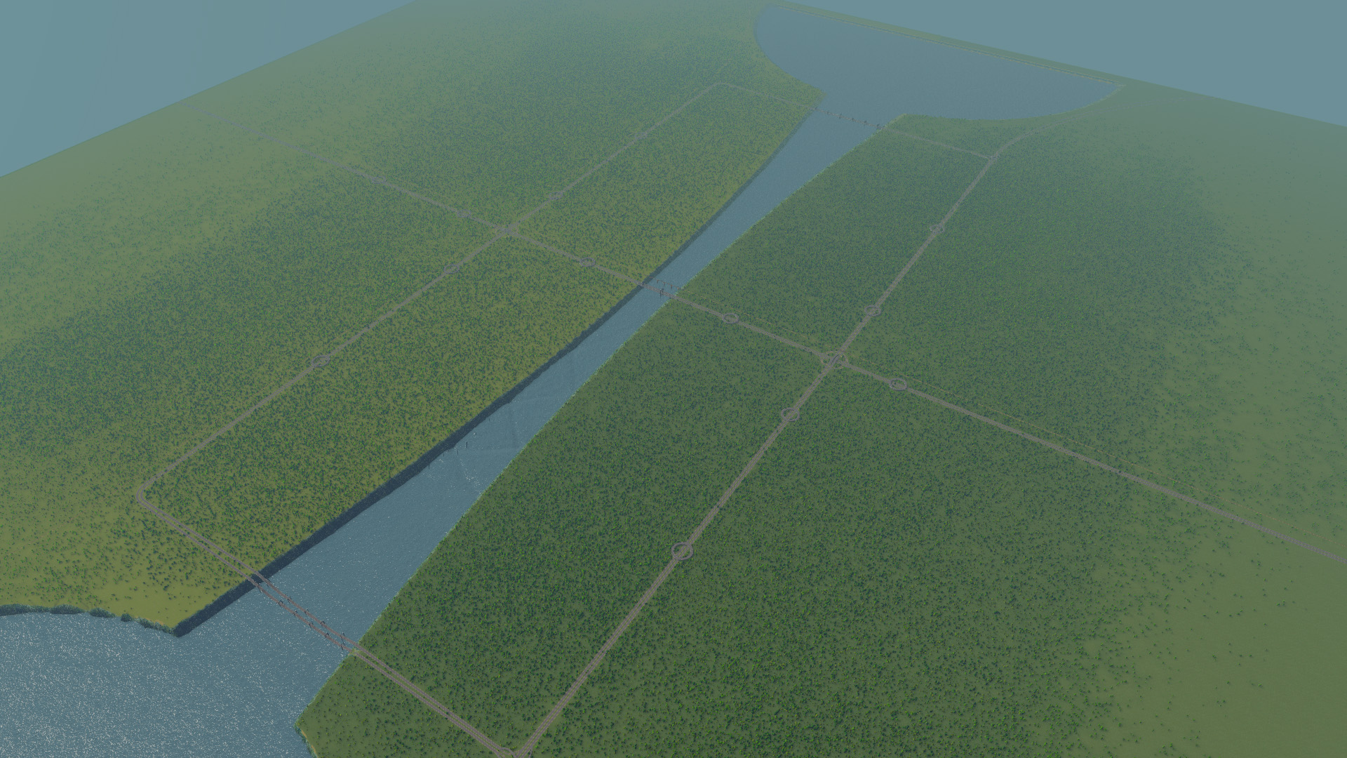 The land is covered with forests, it is fertile everywhere while Ore and Oil cover each half of the land. It offers full outside connections via all transport routes, that also cover the most tiles possible while maintaining a logical pattern.