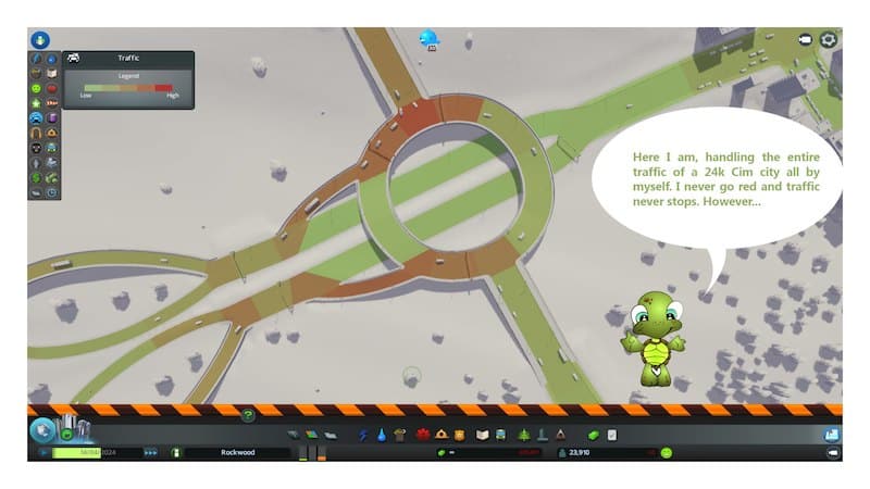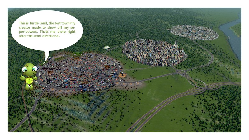 In my tests this system was able to comfortably handle the entire traffic of a 24k Cim town with one Turtle, with traffic reading never going red. Placing one additional highway exit at the industrial area instantly turns the traffic reading towards the green. Note there are no public transportation systems at all in the test city, and all zones are high density. Anyhow, let me know what you think. All suggestions and criticisms are welcome.