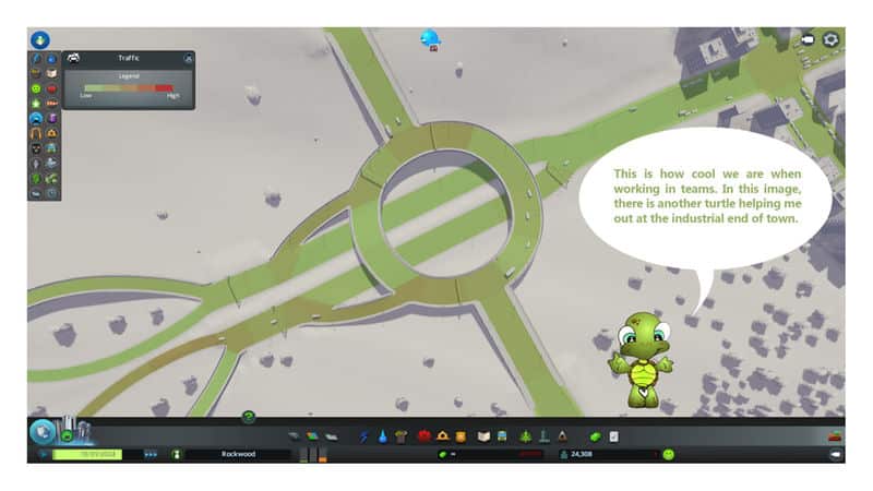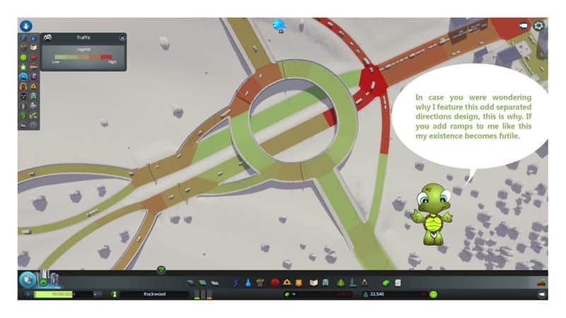 What you have to do is place The Turtle between your highway exit and your town. Then connect the two stub end to the highway and the six lane road on the opposite end to your main residential or commercial hub. Now connect the roundabout ramps to industrial or other main areas and then again those areas to each other and to the main hub, making sure that the connections are far enough away from The Turtle.