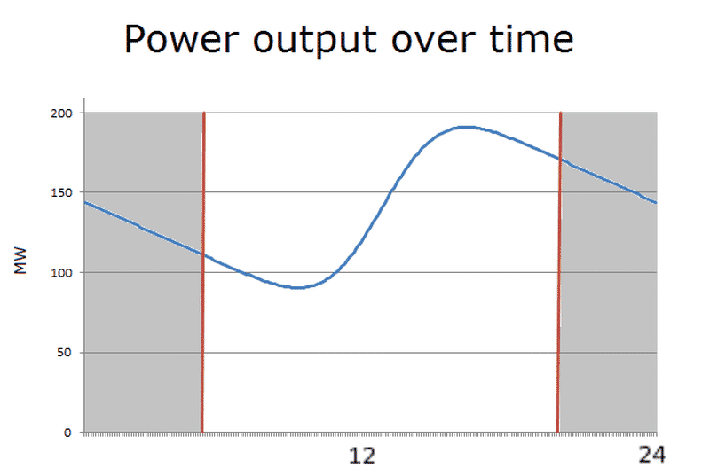 The peak of output is about 4pm , giving out about 190MW and drops to about 90MW at 9am.