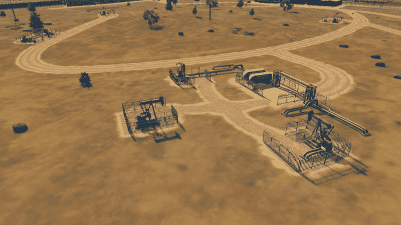 A big field with three oil pumps spaced out over it. This one empties any oil reserve very quickly. Unlocks, like the vanilla oil industry, at milestone five.