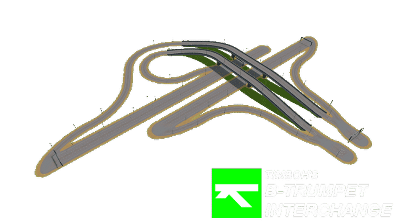 Let’s take a break from all the 4-ways and move on to some 3-way interchanges, and is there any better way to start then with a trumpet interchange. In real life, this is by far the most popular design worldwide because of its low cost and small size compared to T-stacks. However, its capacity is among the lowest of all 3-way interchanges, mainly because of the 270-degree loop some vehicles have to make. In-game it seems to be working quite fine though, so don’t let reality stop you from ploping this down in your city!