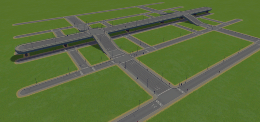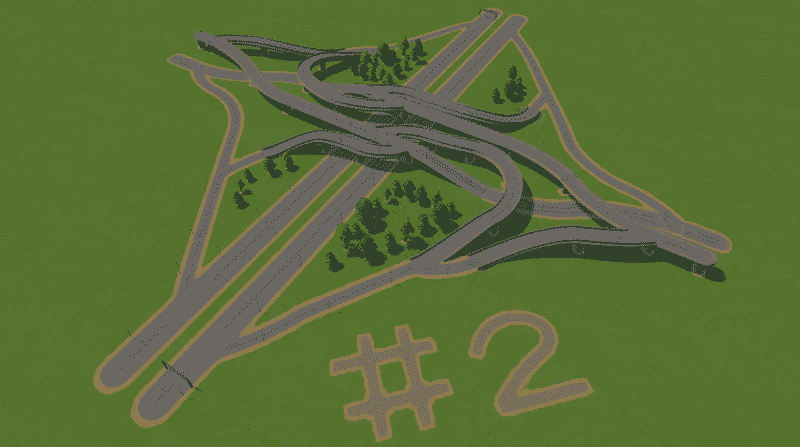 This one is for you, Qfwfq! This is a modified version of the DCMI Interchange, with 2-lane one-way overpasses instead of motorways, making it functional as a free-flowing motorway-to-street transition. Since the 2-lane roads are smaller, there’s a tiny decrease in size, but it’s only slightly noticable.