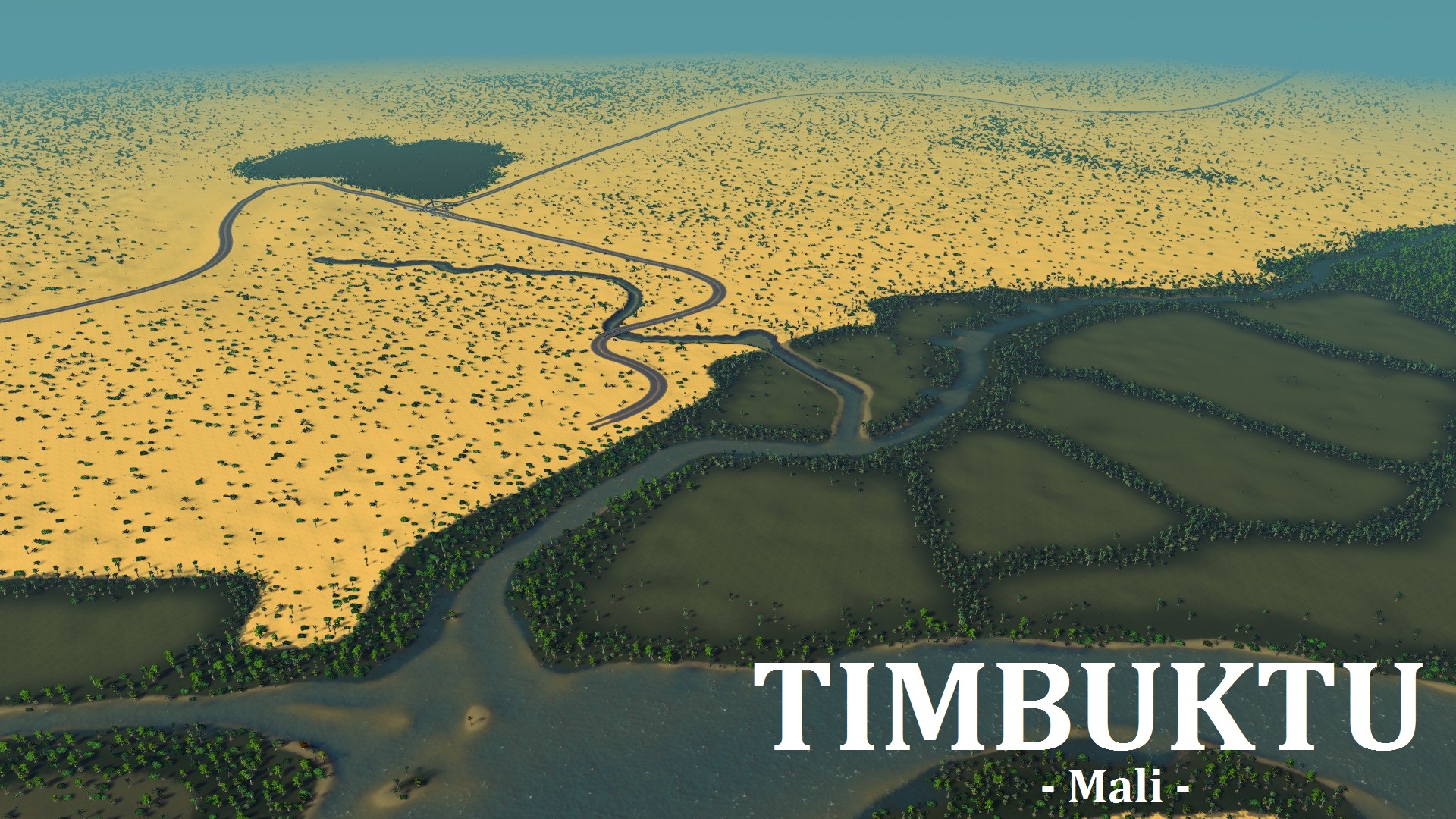 On this map you will start on a tile close to the river, near the town of Kabara. To the north you can find a small spot that is without sand which marks the location of the city of Timbuktu. There is one highway crossing the map. I’ve made rail connection on the border, but you’ll have to connect these yourself. The river is fastflowing and has a ship route. Water is a bit tricky, since you can easily drain the small siderivers. Spreading out you waterpumps, or placing them on the big river will prevent them drying up.