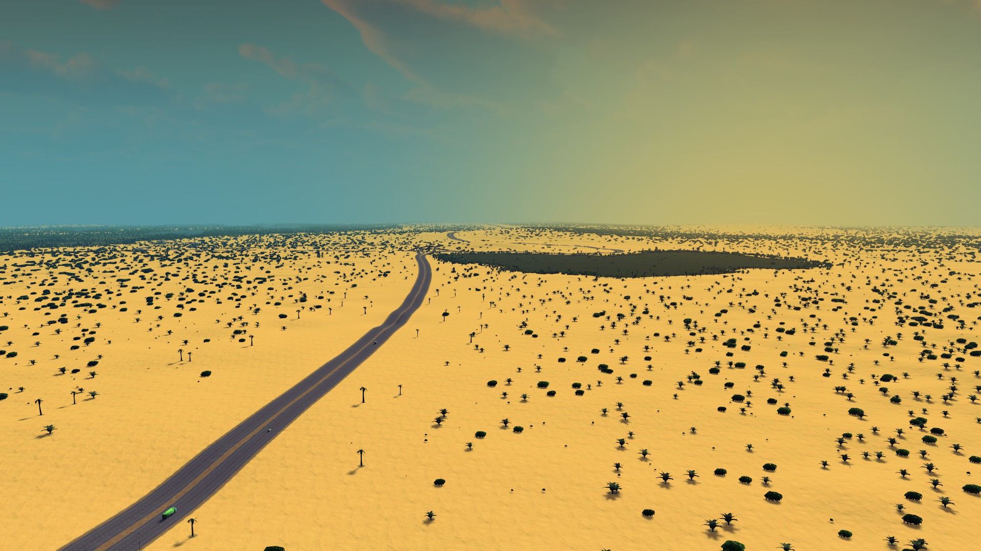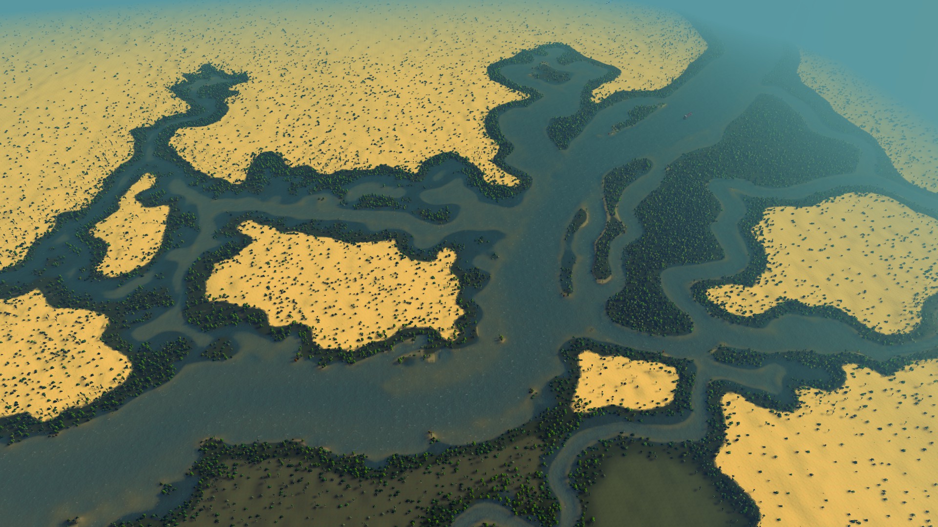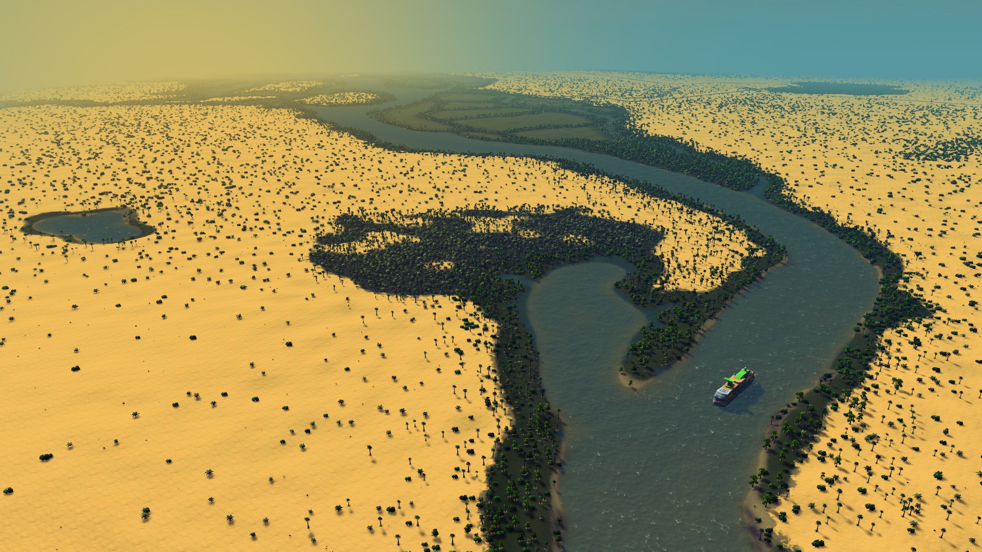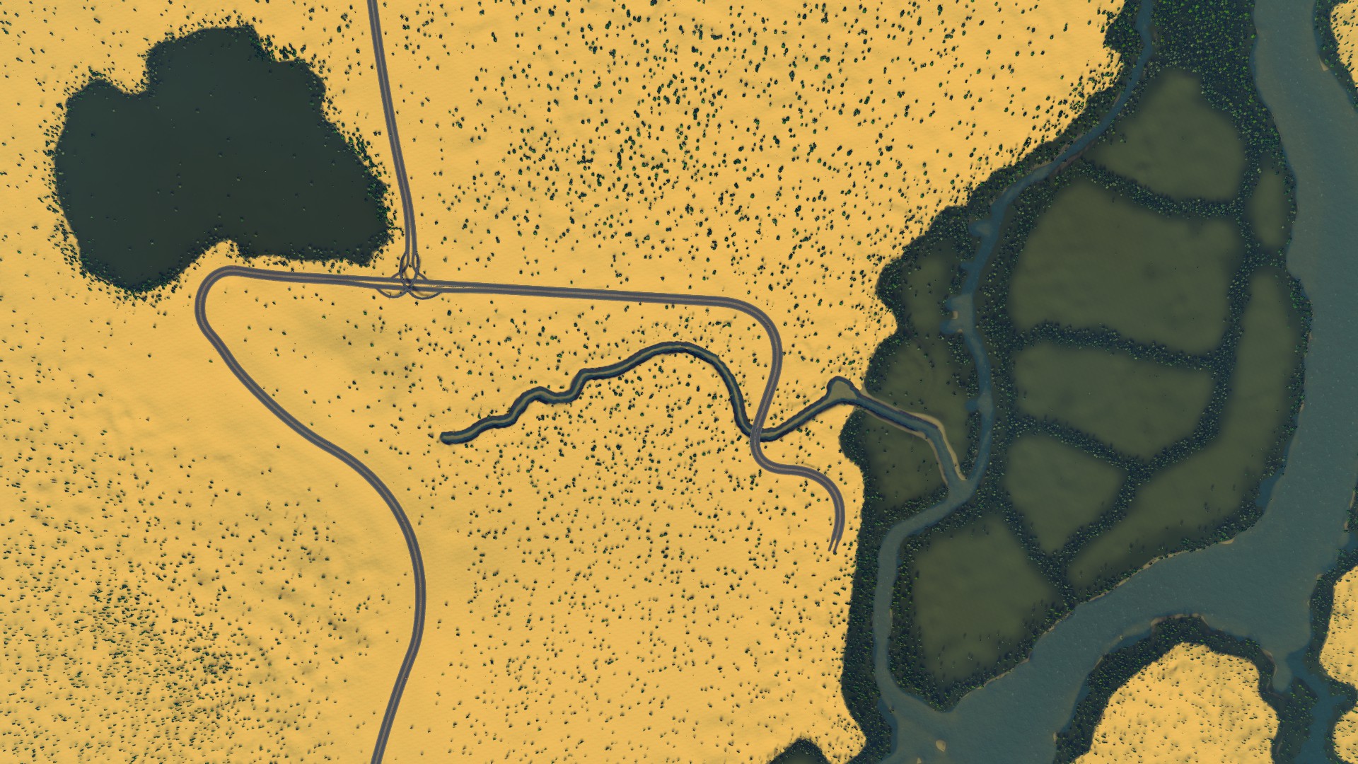 There are several oil & ore fields, and also a few strips of farmland along the river. The map is very flat, and building should be quite easy. In reality, there is an airport to the west of the small canal. I made sure the land there is flat enough for construction.