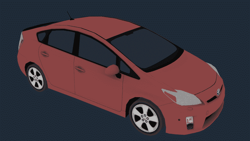 Another Prius, as an electric vehicle. Colors are Red, Blue, Yellow, and Dark grey.