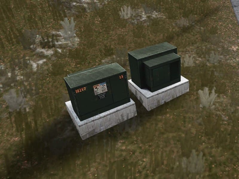 A green pad-mounted electrical transformer. Just a prop, has no power transmission capability.