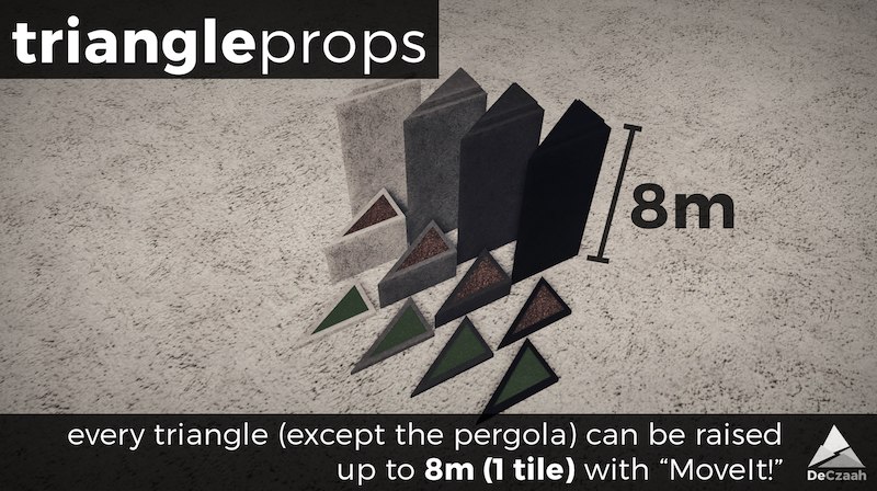 This is a pack with 19 different triangle (german: Dreiecke) assets, to decorate your cities and make modular parks! It’s made with some plannig, to give you the maximum amount of freedom for your creativity. Because of the color variation, you’ve got 76 different variation.