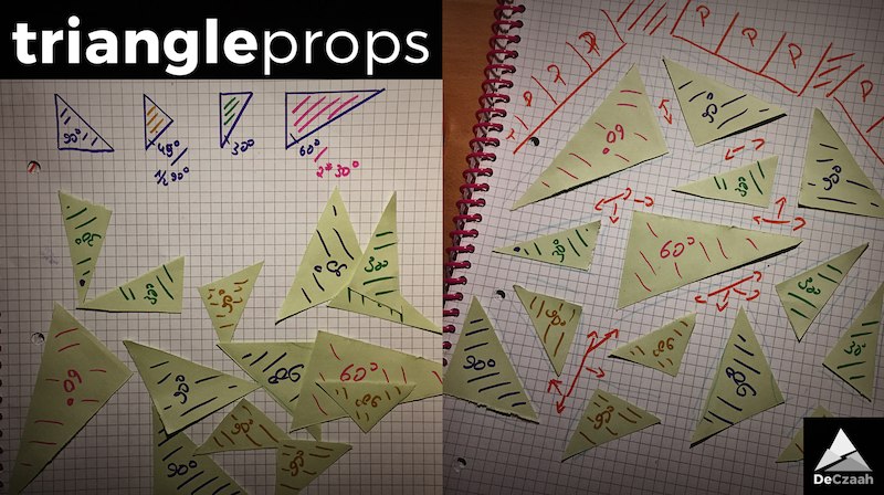 There are up to 6 types of every triangle shape: a 30° piece, a 45° piece, a 60° piece and 90° piece, also elevated ones with a second triangle on it.
