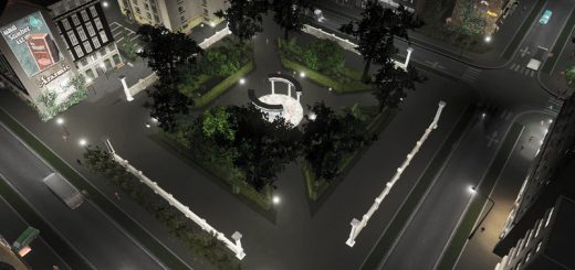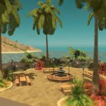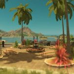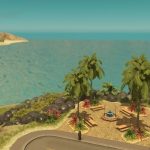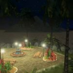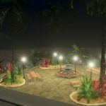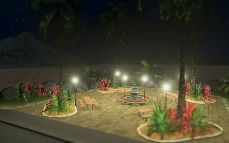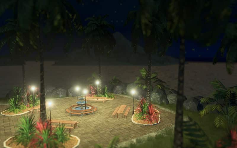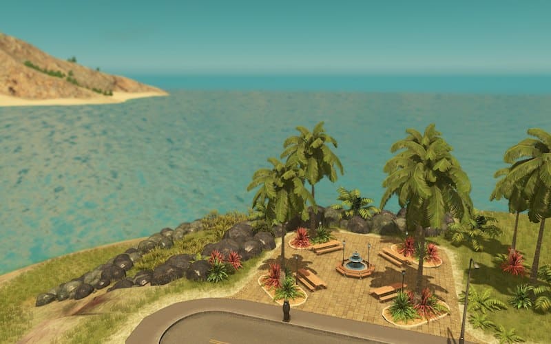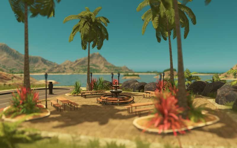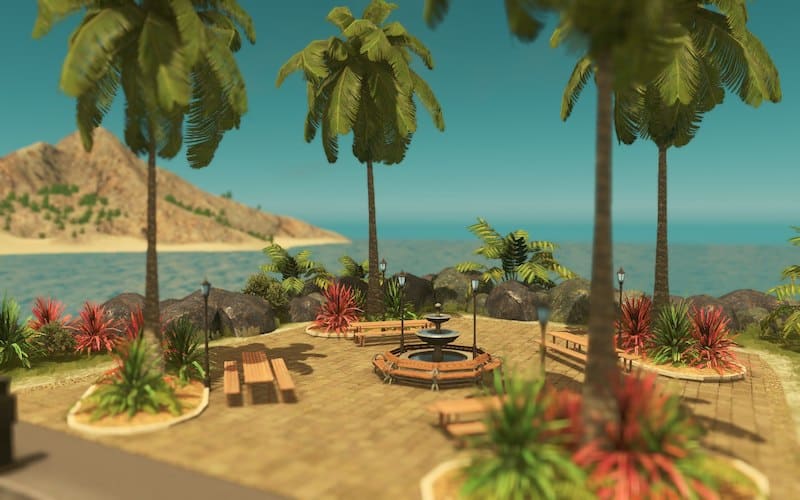 This tropical plaza has shady palm trees and brightly colored plants. It features many sitting areas and a calming fountain, perfect for relaxation by the beach.