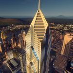 At the time of completion Two Prudential was the world’s tallest reinforced concrete building. Its distinctive shape features stacked chevron setbacks on the north and south sides, a pyramidal peak rotated 45°, and an 80 foot (24 m) spire.