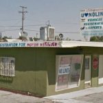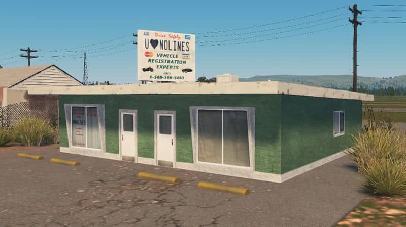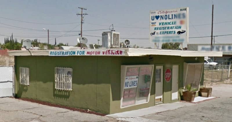 A grungy roadside commercial suite from the ’60s hosting a shady vehicle paperwork service.