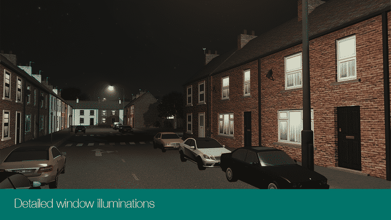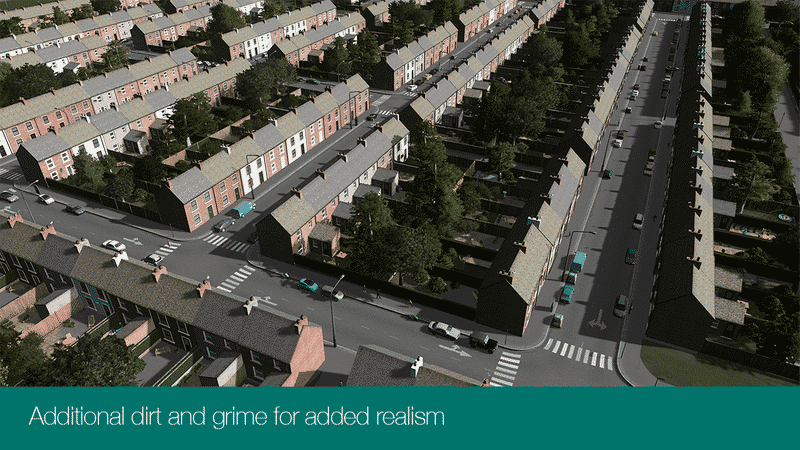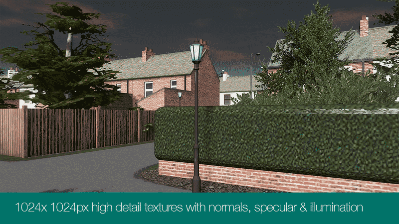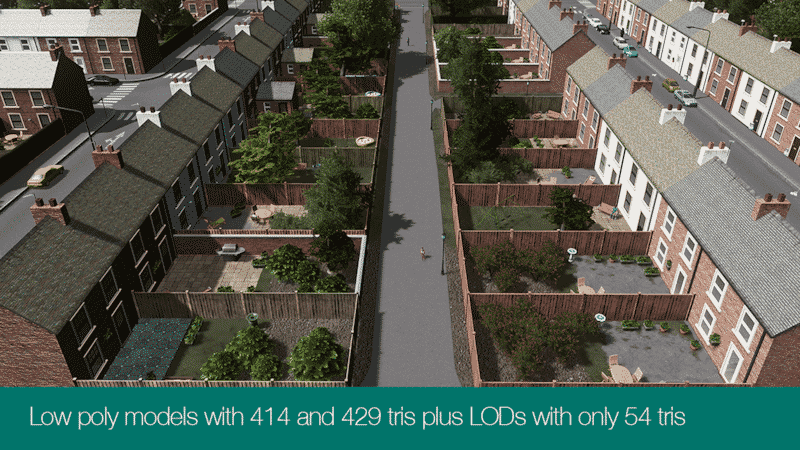 The model is based on my previously realised terraced houses has been reworked with new higher detail textures and gardens which require no additional prop assets.