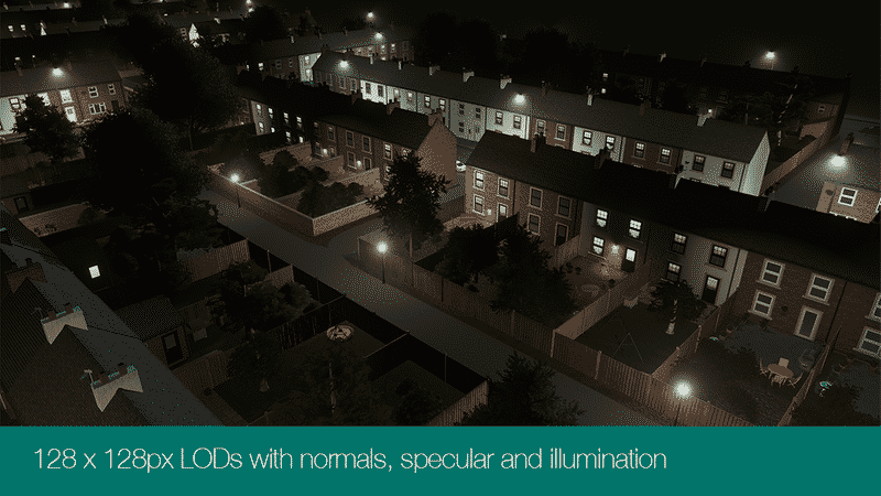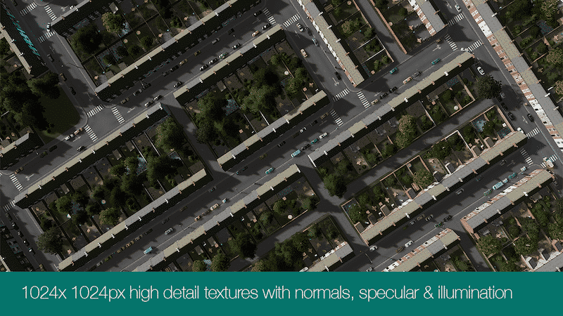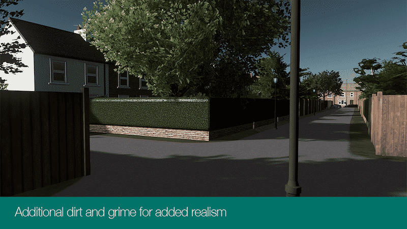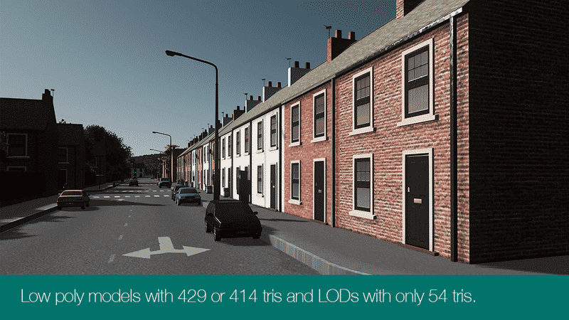 The model is based on my previously realised terraced houses has been reworked with new higher detail textures and gardens which require no additional prop assets.