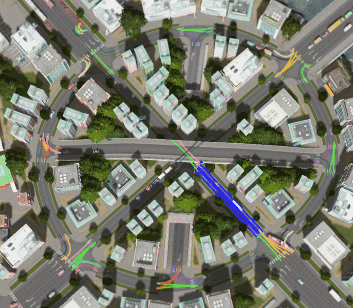 This roundabout can only really work effectively with Traffic++, otherwise the middle will just end up a huge mess. In order to make this work effectively, add traffic lights to the cross roads in the middle.