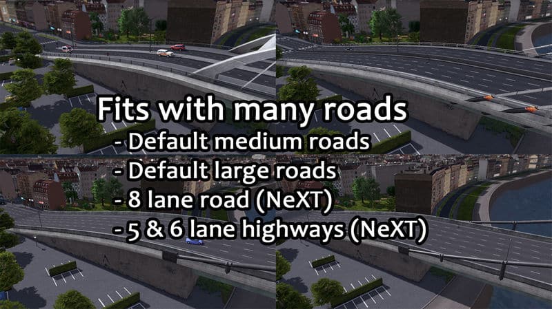 Fits with the default medium roads, default large roads, the NeXT medium roads and the 5 & 6 lane highway roads from NeXT.