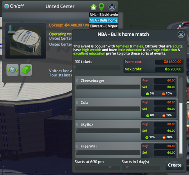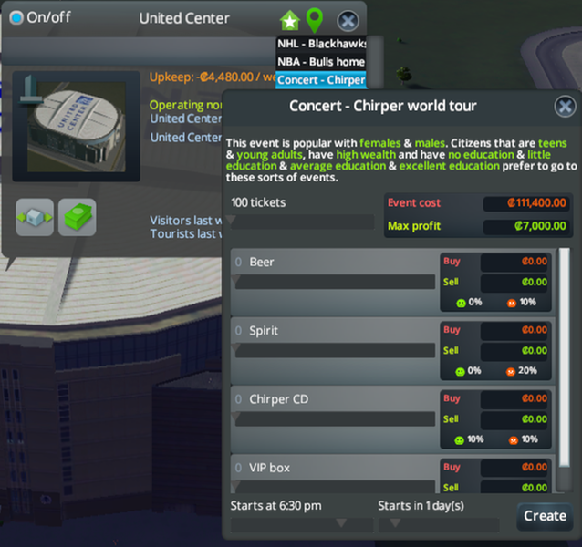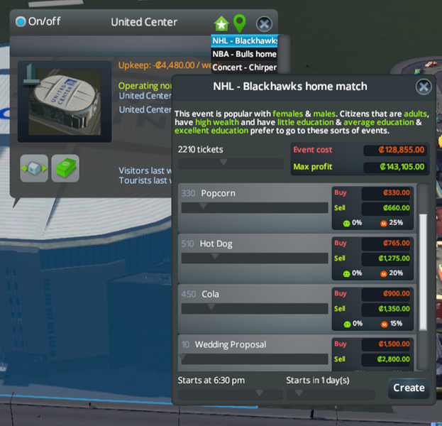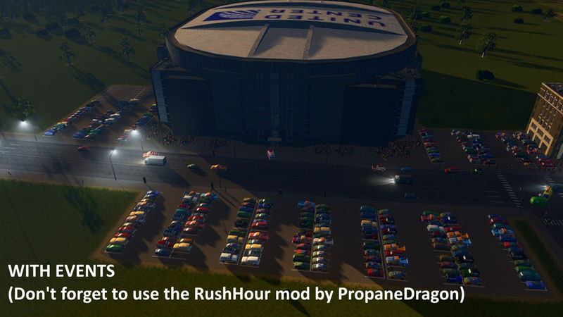 Big thanks to PropaneDragon and Jasmine for the fantastic RushHour mod. Now this arena has three random events (NHL, NBA, Concert)
