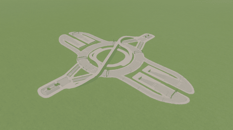 This roundabout allows for easy and nonstop transitioning movement, from highway, to general avenues. Avenues can be upgraded to 6 lane roads without any issue to increase traffic flow. Best for mid (heart of) city transitions to highways, such as freeways or underground highway tunnles, in a realativly small area.