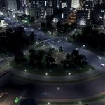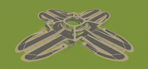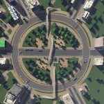 A circular square that also functions as roundabout-intersection combination. The curved sections are one-way counter clockwise. There are two traffic lights where the roundabout and the main boulevard/avenue cross.