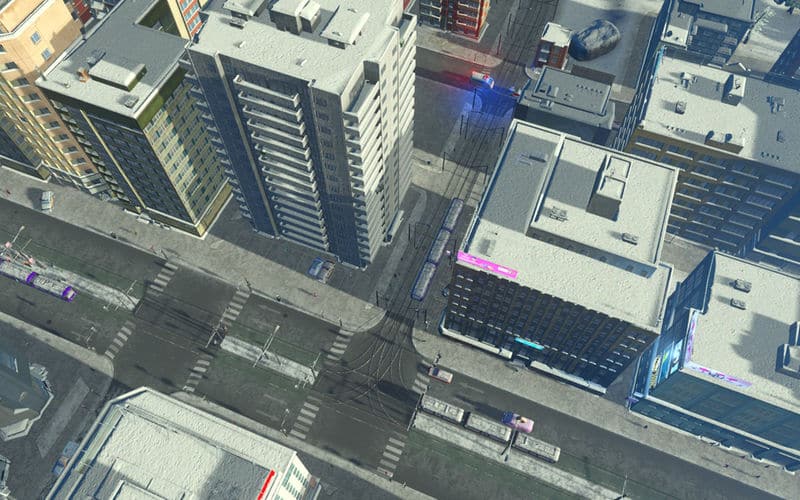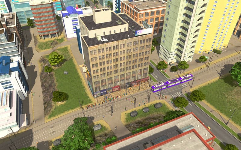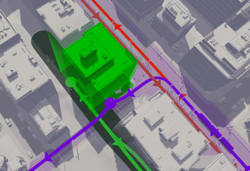 Office building with built in metro station and a direct connection to a tram stop on the left side.