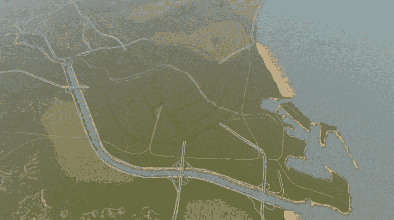 V3: Realised that the terrain didn’t help. As a substitute, I have softened the downtown area and placed trees as a reference of the main roads.
