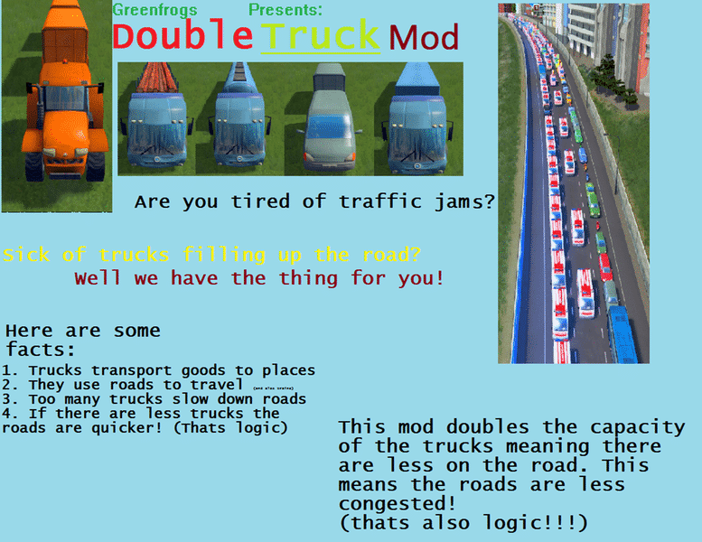 This mod doubles the capacity of trucks by adding an extra trailer to the end of them. It supports tractors, oil trucks, ore trucks, forestry trucks as well as adding trailers to vans. Industries and commercial businesses only use the larger truck if required reducing the number called overall.