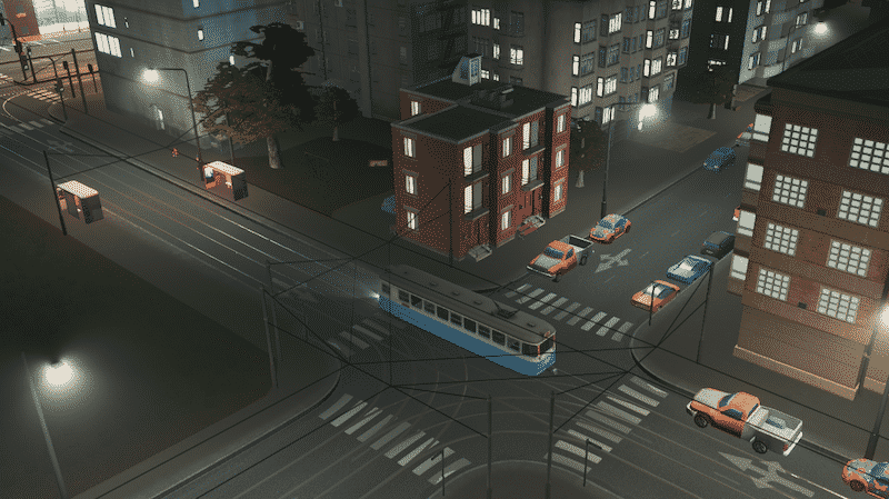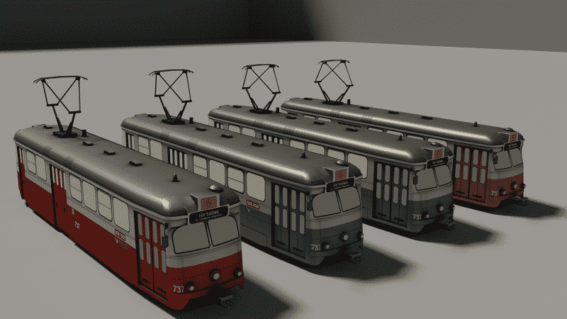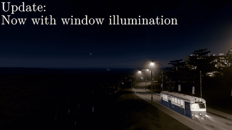I have re-made this vehicle using BL4CKST4LK3R & BloodyPenguin’s Siemens Type R (5-Car Tram version) as a template. This means that this tram now has illuminated windows at night.