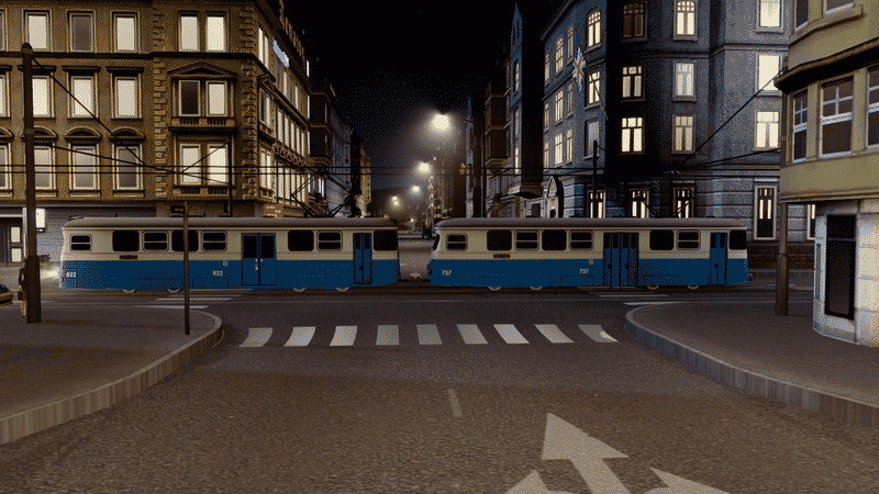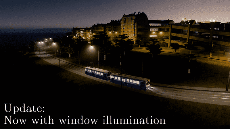 I have re-made this vehicle using BL4CKST4LK3R & BloodyPenguin’s Siemens Type R (5-Car Tram version) as a template. This means that this tram now has illuminated windows at night.