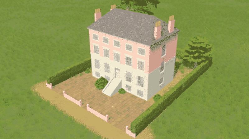 Level 5, detached villa. Inspired by the townscapes of Brighton, Plymouth and Bristol, the building is rendered and painted in a variety of pastel shades, common where buildings were constructed from rubblestone (or Bungaroosh in Brighton), due to a shortage of local brick clay. There are four colour variations – pink, blue, yellow and white. Colours can be changed in the asset editor if you don’t like them!