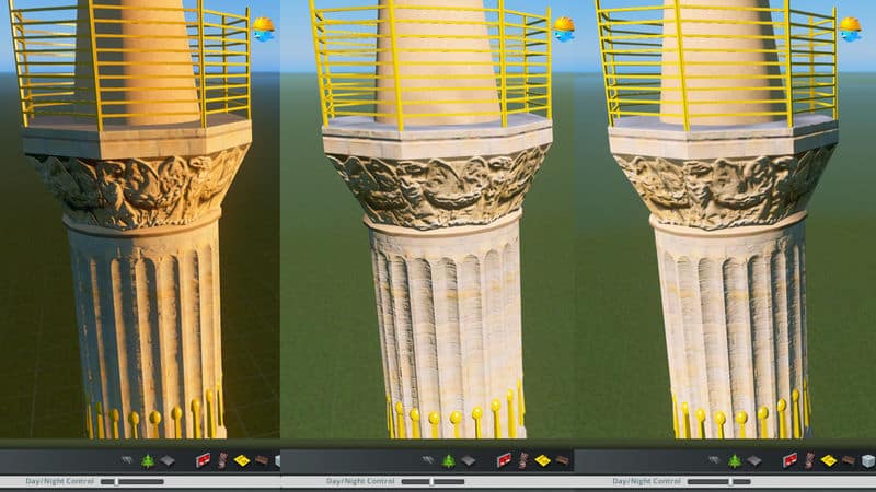 With Svenpotsdam’s permission, I have endeavored to update the column once again. My goal was not to optimize it for performance, but rather to restore the first version, give it a 1:1 scale, and update the LOD model. In doing so, I got carried away, and our Lizzy got a serious make-over! She now has new textures, new geometry, a new base, new proportions, new normal and spec maps, new lighting, and an entirely new, hand-made, matching LOD model.