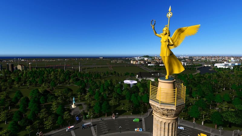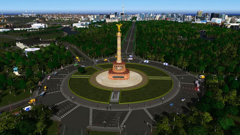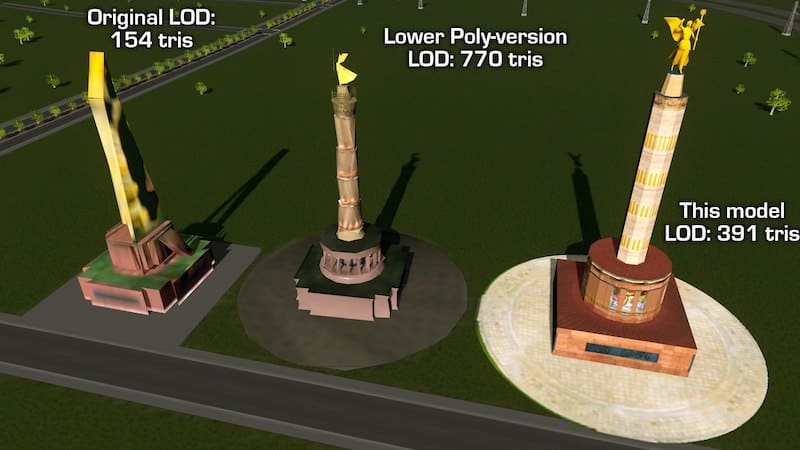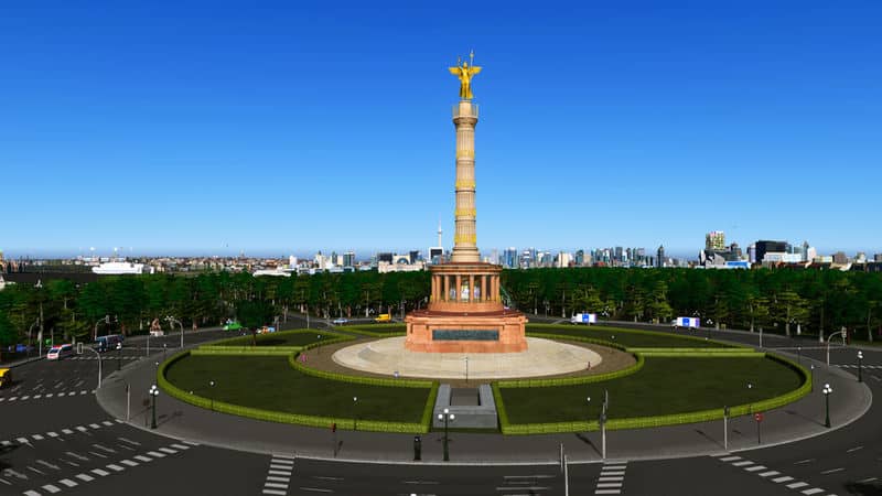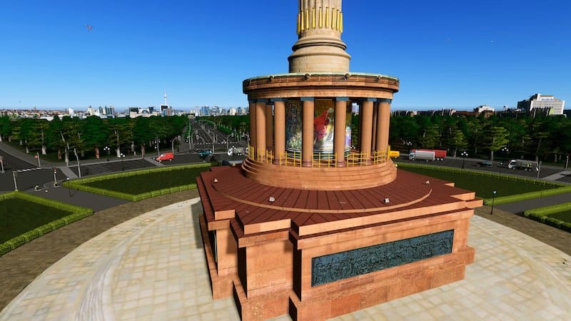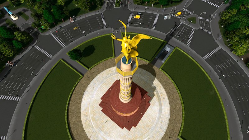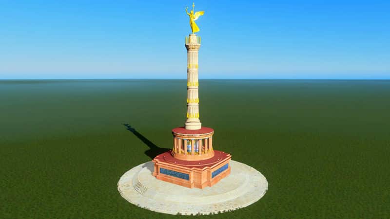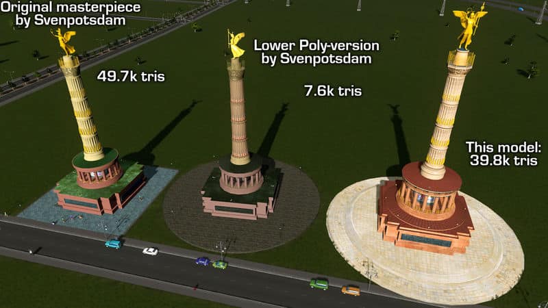 Svenpotsdam made the first version of the Siegessäule for Cities:Skylines in 2015. It was one of his first models, and it includes an etirely original mesh of the statue! He has since updated it twice, once with a round base and After-Dark lighting, and again with a LOWER Poly count. His column was one of the first things that I downloaded from the workshop, and I have always preferred the original version (49k tris) because of it’s gleaming gold sculpture and fluting details. It has been the centerpiece of my Berlin 1:1 build.