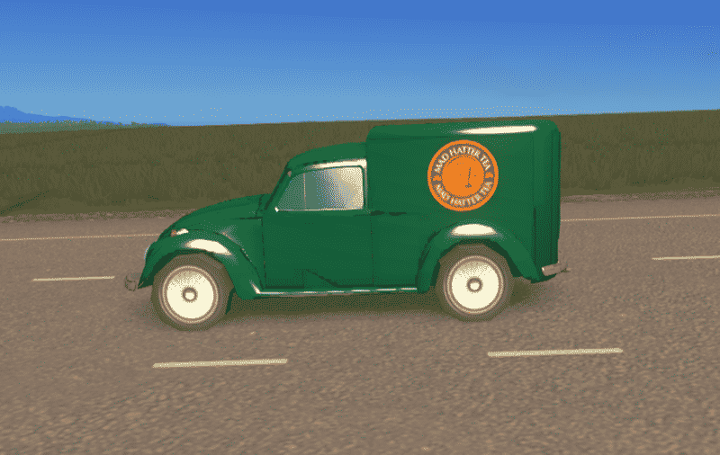 An old volkswagen beetle tea van, from the madhatter tea company, used for transporting tea in and out of your city.