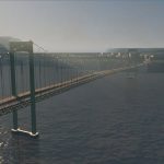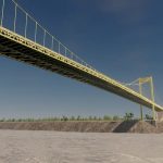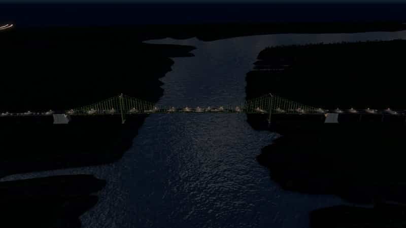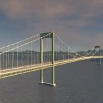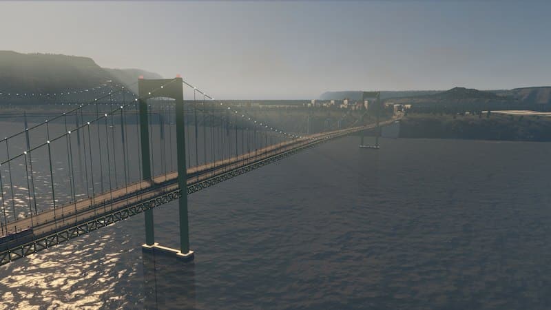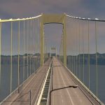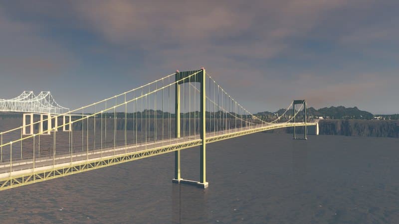 This model is roughly dimensionally accurate, you have four tiles to work with across the width of the bridge, though it squeezes down a bit at each tower. The length and height are identical to real life (280 meters anchorage to tower, 610 meters between towers, total length from outer end of anchorages = 1170 meters, or 146.25 tiles. Height from base of tower to road deck varies between 39 meters at the anchorages, 45 meters at the towers, and 50 meters at the center of the span.)
