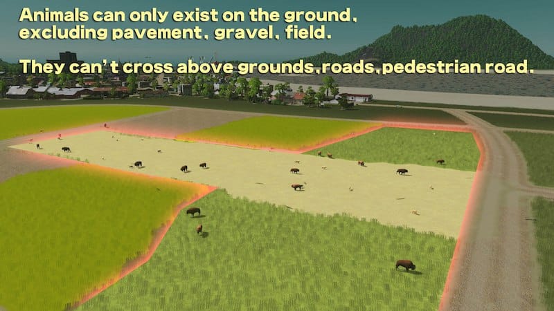 発生した動物は地面を移動しますが、舗装面、畑、砂利面では発生せず移動もできません。道路や歩道も横断しません。
