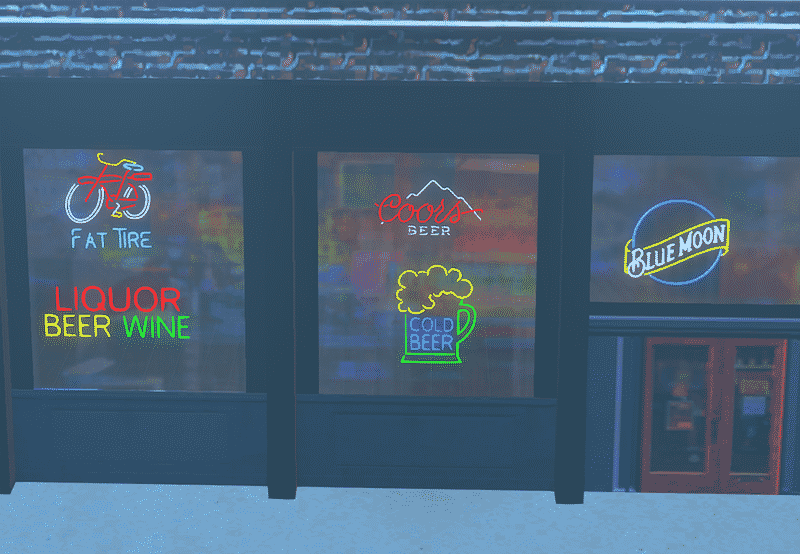 Neon signs for – Fat Tire, Coors, Blue Moon, Budweiser